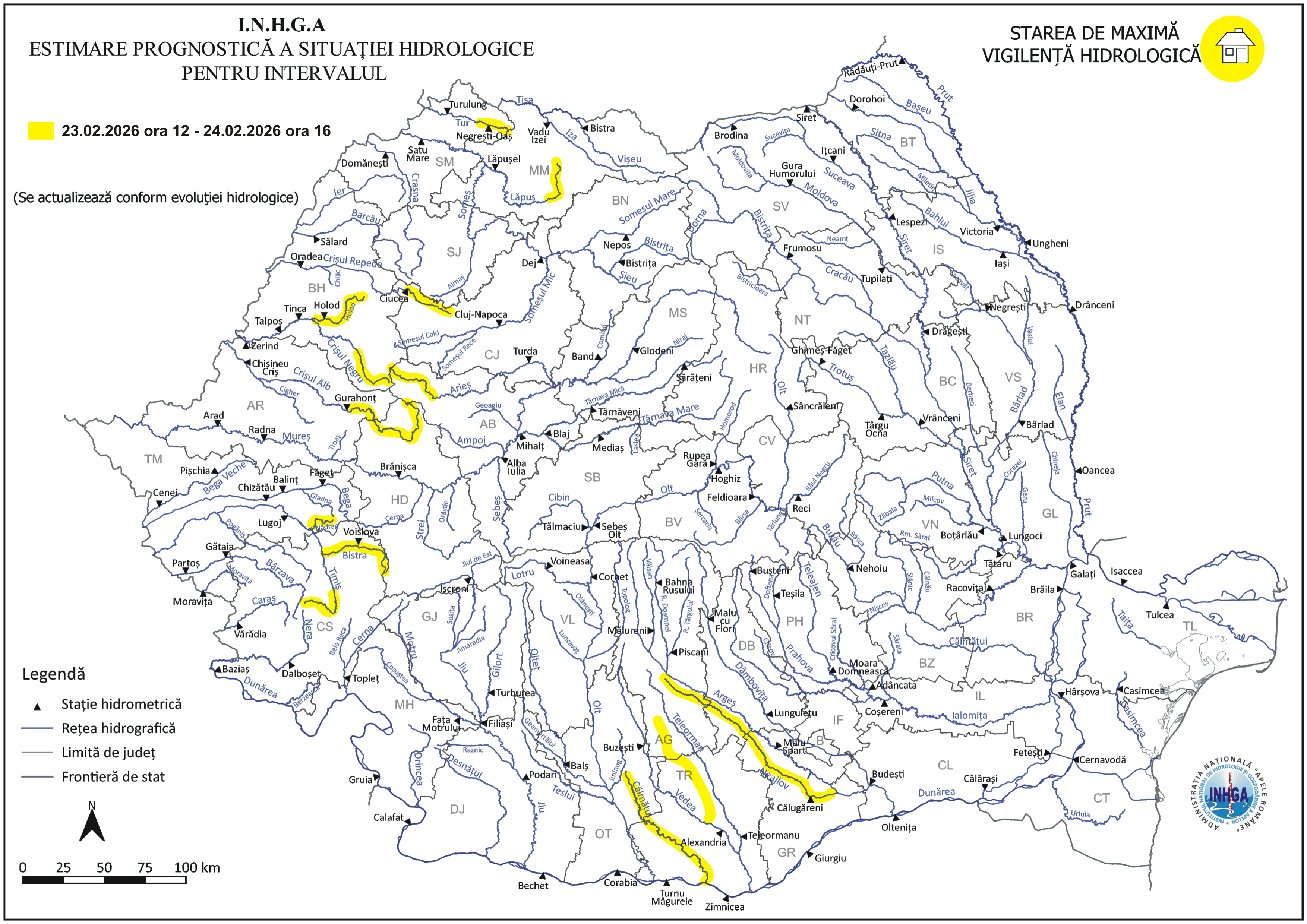 Hidrologii au emis Cod galben de inundaţii, până marţi după-amiază, pe sectoare de râuri din 15 judeţe din vestul, nord-vestul şi sudul ţării. Astfel, sunt aşteptate scurgeri importante pe versanţi, torenţi şi pâraie, viituri rapide pe râurile mici, care pot provoca inundaţii locale, precum şi creşteri de debite şi niveluri pe unele râuri, cu posibile depăşiri ale cotelor de atenţie.