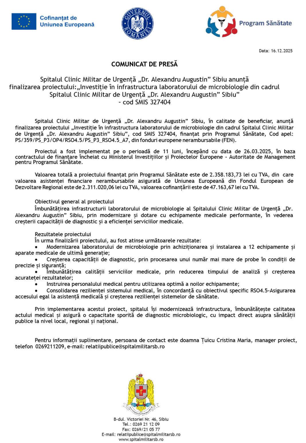 Pentru informații suplimentare, persoana de contact este doamna Țuicu Cristina Maria, manager proiect, telefon 0269211209, e-mail: relatiipublice@spitalmilitarsb.ro